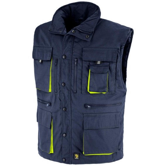 Bezrękawnik ocieplany wykonany z materiału zewnętrznego o składzie 65% poliester, 35% bawełna. Ciepła wewnętrzna ocieplina z pikowaną podszewką od strony wewnętrznej. Zapięcie na suwak kryty listwą zapinaną na napy. Wysoka stójka kołnierza, przedłużony tył bezrękawnika i ściągacze wokół ramion zapewniają dodatkowy komfort cieplny. Aż 11 funkcjonalnych kieszeni. Rozmiary: M - XXXL. Pakowanie: 1/ 20 karton