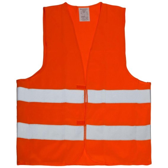 Kamizelka ostrzegawcza wykonana w 100% z poliestru o gramaturze 120 g/m², posiada dwa pasy odblaskowe dookoła korpusu. Zapinana na rzep. Kat. II Certyfikat UECE, zgodność z normą EN ISO 20471:2013