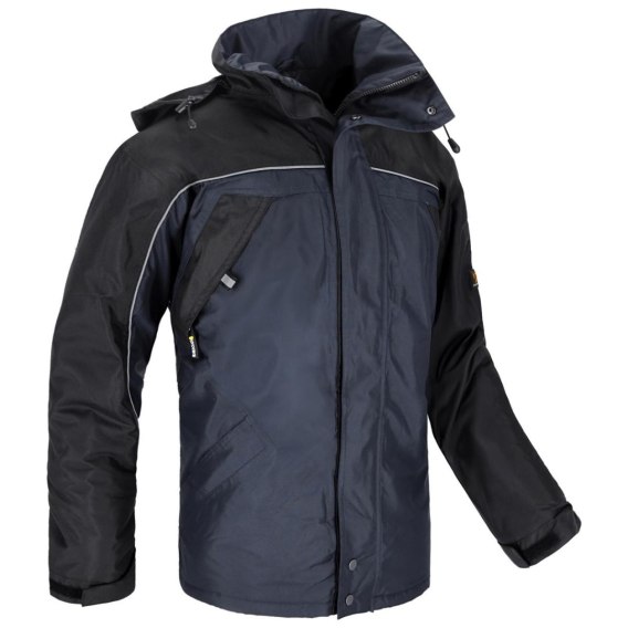 Kurtka ocieplana z pikowaną poliestrową podszewką oraz warstwą zewnętrzną wykonaną w 100% z impregnowanego poliestru. Zasuwana na zamek błyskawiczny osłonięty zapinaną listwą. Posiada dwie kieszenie na klatce piersiowej zasuwane na suwak i kryte listwą, dwie kieszenie dolne zapinane na suwak, a także jedną kieszeń od strony wewnętrznej zapinaną na rzep. Rękawy ze ściągaczami z dodatkową regulacją na rzep zwiększają komfort jednocześnie poprawiając izolację termiczną. Odsuwany kaptur, ściągany za pomocą gumki ze stoperami. Podklejane szwy zwiększają odporność na warunki atmosferyczne. Kurtka posiada regulację obwodu dla lepszego dopasowania i ochrony przed zimnem. Kolory: granatowy/czarny. Rozmiary: S- XXL. Pakowanie: 1/10 karton.