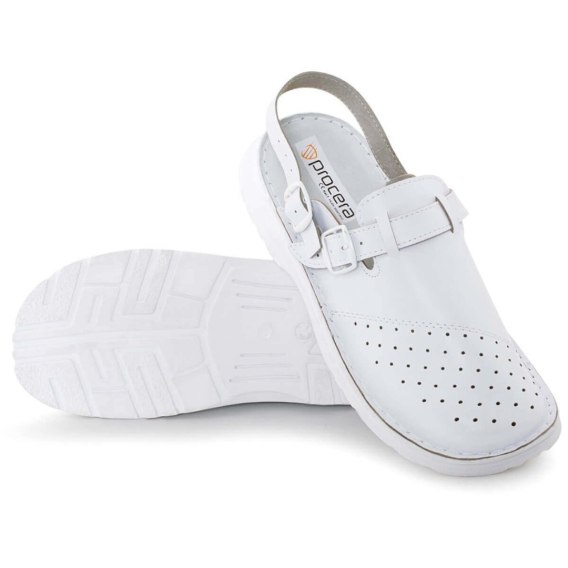 Obuwie profilaktyczne wykonane ze skóry bydlęcej pokrytej specjalną membraną ułatwiającą czyszczenie, dezynfekcję i konserwację. Cholewka zamknięta z perforacją, pasek dwufunkcyjny przekładany na piętę. Wyściółka ze skóry naturalnej. Spód o urzeźbieniu antypoślizgowym z poliuretanu, wewnętrzny profil ortopedyczny. Wierzch łączony ze spodem szyciem ręcznym. Obuwie doskonale sprawdzi się do użytkowania w placówkach służby zdrowia, handlowych, przemyśle spożywczym. Rozmiary: 40-46.