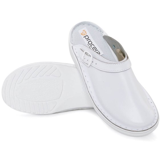 Obuwie profilaktyczne wykonane ze skóry bydlęcej pokrytej specjalną membraną ułatwiającą czyszczenie, dezynfekcję i konserwację. Cholewka zamknięta, pasek dwufunkcyjny przekładany na piętę. Wyściółka ze skóry naturalnej. Spód o urzeźbieniu antypoślizgowym z poliuretanu, wewnętrzny profil ortopedyczny. Wierzch łączony ze spodem szyciem ręcznym. Obuwie doskonale sprawdzi się do użytkowania w placówkach służby zdrowia, handlowych, przemyśle spożywczym. Rozmiary: 36-40.