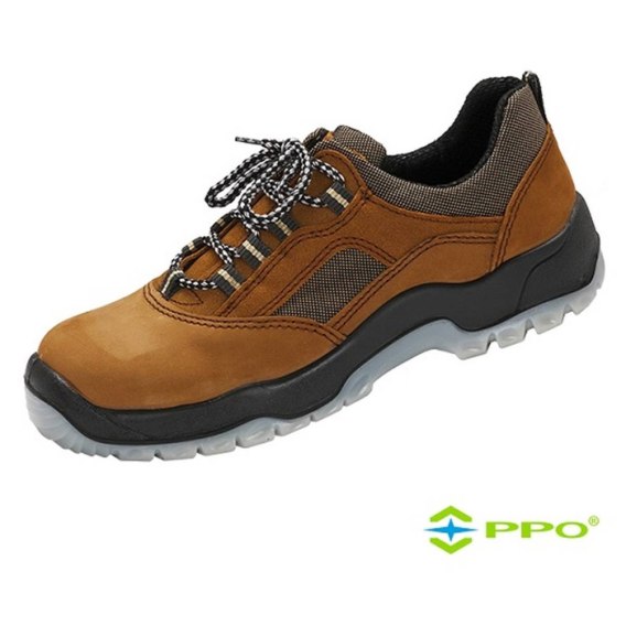 Półbuty PPO-62N S1 Podeszwa dwuwarstwowa (PU/TPU): bieżnik wykonany z litego transparentnego poliuretanu termoplastycznego, międzypodeszwa wykonana ze spienionego poliuretanu komórkowego, odporna na oleje, benzynę i inne rozpuszczalniki organiczne. Nie rysuje powierzchni. Bardzo dobre właściwości przeciwpoślizgowe - klasa SRC, szczególnie zalecane do pracy na gładkich nawierzchniach nowoczesnych hal produkcyjnych. Nie zalecane do pracy na lodzie i śniegu. Doskonała giętkość i elastyczność, również w niskich temperaturach. Lekkie, trwałe i wytrzymałe, skutecznie łagodzi nierówności podłoża. Bardzo odporne na ścieranie, przecięcia i pękanie, zabezpiecza przed pogłębianiem się rys powstałych w wyniku mechanicznego uszkodzenia podeszwy. Odporne na temperaturę w krótkotrwałym kontakcie do 120°C. Konstrukcja podeszwy chroni skórę obuwia w jego przedniej części. Absorpcja energii w części piętowej. Technologia łączenia podeszwy z cholewką - bezpośredni, dwustopniowy wtrysk poliuretanu i poliuretanu termoplastycznego zapewnia trwałość połączenia spodu z wierzchem i nieprzemakalność obuwia od podłoża. Duża stabilność podeszwy. Urzeźbienie czubka podeszwy dodatkowo zabezpiecza przed poślizgiem przy pracach na pochyłych terenach. Wierzch obuwia wykonany ze skór nubukowych i weluru o wysokim współczynniku przepuszczalności pary wodnej, 15-krotnie wyższym od wymagań normy z wstawkami z oddychającego materiału. Podszewki z włóknin obuwniczych o dużej przepuszczalności pary wodnej oraz odporności na ścieranie, kołnierz i język miękko wykończone pianką. Bardzo dobre właściwości higieniczne obuwia. Metalowy podnosek chroniący przed urazami o energii uderzenia do 200J lub naciskiem o sile 15kN. Wyposażone w wyjmowaną higroskopijną wyściółkę, posiadającą bardzo dobre właściwości przeciwpotne. Antyelektrostatyczne. Obuwie produkowane jest w numeracji francuskiej w rozmiarach od 39 do 47. Tęgość - H ½.