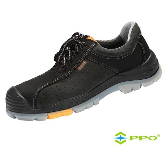 Półbuty PPO-704 S1 SRC Cholewki wykonane ze skór welurowych oraz nubuku o wysokim współczynniku przepuszczalności pary wodnej, 15-krotnie wyższym od wymagań normy. Podszewka z materiału Super Royal® dającego uczucie suchości i komfortu. Język z weluru miękko wypełniony pianką lateksową. Podeszwa z poliuretanu i poliuretanu termoplastycznego PU/TPU z systemem Shockabsorber. Bieżnik wykonany z litego transparentnego poliuretanu termoplastycznego, międzypodeszwa wykonana ze spienionego poliuretanu komórkowego odporna na oleje, benzynę i inne rozpuszczalniki organiczne, odporne na temperaturę w krótkotrwałym kontakcie do 120°C. Konstrukcja podeszwy chroni skórę obuwia w jego przedniej części. Nie rysuje powierzchni. Bardzo dobre właściwości przeciwpoślizgowe - klasa SRC. Doskonała giętkość i elastyczność również w niskich temperaturach. Lekkie, trwałe i wytrzymałe, skutecznie łagodzi nierówności podłoża. Odporne na ścieranie, przecięcia i pękanie, zabezpiecza przed pogłębianiem się rys powstałych w wyniku mechanicznego uszkodzenia podeszwy. Pochłania energię w części piętowej, doskonale chroni piętę, a specjalnie wyprofilowany obcas dodatkowo chroni nogę przed skręceniem. Trwałe i wytrzymałe, nieprzemakalne od podłoża, z perforowanym podnoskiem kompozytowym AirTec® chroniącym przed uderzeniami z energią do 200J, w którym specjalnie rozmieszczone otworki gwarantują stopie naturalną oddychalność. Doskonała wentylacja i właściwości higieniczne obuwia. Wyposażone w miękką, wygodną, przyjazną skórze stopy, higroskopijną wyściółkę z filtrem aktywnego węgla o właściwościach przeciwgrzybicznych, przeciwpotnych i antybakteryjnych, co zapewnia stopie neutralny zapach, uczucie suchości i przyjemnego chłodu. Wyściółka nadaje się do wielokrotnego prania. Antyelektrostatyczne. Amagnetyczne, nie zawiera metali. Obuwie produkowane jest w numeracji francuskiej w rozmiarach od 39 do 47. Tęgość - H ½.