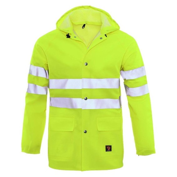 Kurtka wykonana z tkaniny Probaltic Fluo (dzianina poliestrowa powlekana polichlorkiem winylu), o gramaturze 350 g/m2, - odpornej na zginanie w niskich temperaturach (do -50 C). Taśmy odblaskowe termotransferowe 3M art. 8712. Kurtka o długości ¾ (poniżej bioder) zapinana na metalowe, nierdzewne napy. Przód i tył kurtki wykonany z jednego fragmentu materiału - bez szwów bocznych. Tył kurtki z karczkiem, przykrywającym otwory wentylacyjne. Rękawy jednoczęściowe reglanowe z doszytymi wiatrołapami. Kurtka posiada dwie kieszenie dolne przykryte patkami. Kaptur prosty, ściągany sznurkiem ze stoperem w celu regulacji owalu twarzy. Na całym obwodzie kurtki i rękawów naniesione po 2 pasy odblaskowe. Szwy zgrzane prądem wysokiej częstotliwości. Spełnia wymagania normy EN 13688, EN 343, materiał oraz taśmy odblaskowe spełniają wymagania normy EN 20471.