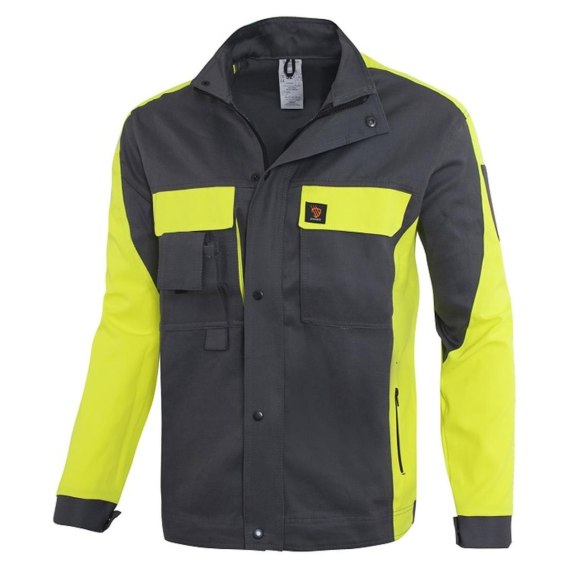 Kurtka Proplus - tkanina zasadnicza: 100% bawełna o gramaturze 250 g/m2, wstawki z materiału kontrastowego: 65% poliester, 35% bawełna o gramaturze 250 g/m2, zapinana na zamek błyskawiczny osłonięty listwą materiałową zapinaną na napy. 5 funkcjonalnych kieszeni, 2 kieszenie na klatce piersiowej w tym kieszeń na telefon, dwie kieszenie boczne zapinane na zamek błyskawiczny. Dodatkowa regulacja obwodu pasa. Rygle wzmacniające i podwójne szwy zwiększające wytrzymałość. Rozmiary od 48-62.