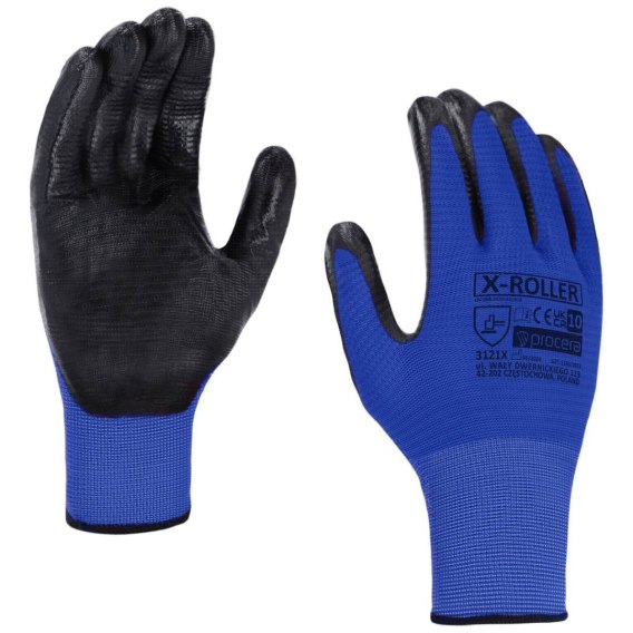 Rękawice X-ROLLER wykonane z prążkowanego poliestru, powlekane w części chwytnej nitrylem. Idealne do prac manualnych. Podwyższona odporność na oleje oraz smary. Dobrze dopasowują się do kształtu dłoni. Zakończone ściągaczem. CE EN 388. Opakowanie: karton 12/240. Kolor: niebieski/czarny.