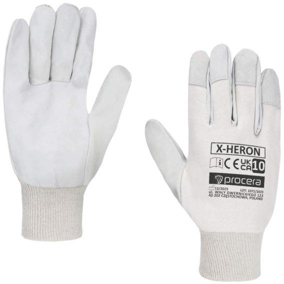 Rękawice X-HERON wykonane w części chwytnej z jednego kawałka licowej skóry koziej , wierzch wykonany z elastycznej tkaniny bawełnianej w naturalnym kolorze. Kciuk i końcówki palców ze skóry. Zakończenie ściągaczem zapewnia doskonałe dopasowanie. Idealne do prac manualnych. Bardzo dobra chwytność. Duża wytrzymałość na ścieranie.Dobrze dopasowują się do kształtu dłoni. CE EN 420. Opakowanie: karton 12/120. Kolor: kremowo/biały.