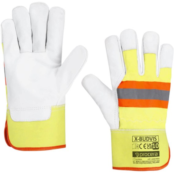 Rękawice robocze X-BUDVIS wzmocnione skórą kozią, całodłonicowe, tkanina drelichowa w kolorze jaskrawożółtym z dodatkowym pasem odblaskowym. Część chwytna wykonana z jednego elementu skóry. Gumka ściągająca powyżej mankietu. Wzmocnienie na linii kości śródręcza i czubków palców. Mankiet drelichowy podgumowany zakończony lamówką. Wewnętrzna część chwytna wypodszewkowana. CE EN 21420:2020. Opakowanie zbiorcze: 72 pary. Rozmiar: 10.