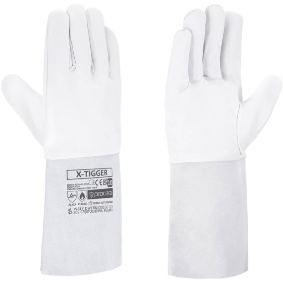 Rękawice skórzane X-TIGGER wykonane z koziej skóry licowej, szyte nićmi z KEVLARU . Rękawice wyposażono w przedłużany, skórzany mankiet wykonany ze skóry dwoinowej, który chroni większą powierzchnię rąk przed temperaturą oraz odpryskami stopionego metalu. Długość 35cm. Opakowanie: karton 12/72. Kolor: biały. Kat. II, EN388, EN407, EN 12477