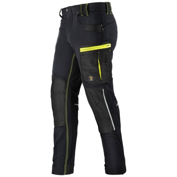 Spodnie wykonane z wysokiej jakości, znanej z odzieży outdoorowej elastycznej tkaniny typu "4-way stretch" o składzie: 90% NYLON, 10% SPANDEX o gramaturze 240 g/m^2. Posiadają wiele funkcjonalnych kieszeni, w tym dwie kieszenie przednie, dwie podwójne kieszenie na udach oraz dwie kieszenie tylne zapinane na rzepy. Ich niezwykle praktyczny krój i elastyczny materiał rozciągający się we wszystkich kierunkach zapewniają maksymalną swobodę ruchów. Wzmocnienia z materiału zabezpieczającego przed przetarciem na nogawkach, kieszeniach i kolanach z możliwością zastosowania wkładek nakolannikowych. Rygle wzmacniające i potrójne szwy zwiększające wytrzymałość. Przyjemne w dotyku wykończenie wewnętrzne. Sprawdzą się zarówno w pracy, jak i podczas zajęć rekreacyjnych. Nowoczesna kolorystyka i design. Elementy odblaskowe w szwach bocznych i z tyłu. Kolor: czarny. Dostępne w rozmiarach 46-60. Pakowanie: 1/20 karton.