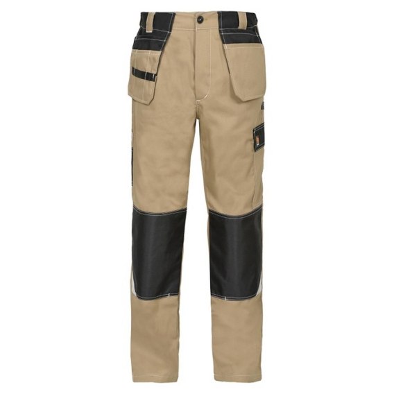 Spodnie do pasa PROMONTER. Spodnie wykonane z wytrzymałej na rozdzieranie i tarcie tkaniny typu Twill o składzie 65% poliester i 35% bawełna, o gramaturze 260g/m2. Na kolanach wzmocnienia z materiału typu OXFORD zabezpieczającego przed przetarciem. Możliwość zastosowania wkładek nakolannikowych. Dodatkowe elementy odblaskowe. Duża liczba funkcjonalnych kieszeni w tym dwie zwiększające swobodę ruchów podwójne wiszące kieszenie monterskie z podziałkami i dodatkowymi elementami do zamocowania akcesoriów lub narzędzi, kieszeń na calówkę, kieszeń typu bojówka, dwie kieszenie tylne i dwie kieszenie boczne. Gumy dopasowujące w tylnej części pasa. Dodatkowe wzmocnienia, rygle i podwójne szwy zwiększające wytrzymałość. Wyprodukowano w Polsce zgodnie z ISO 9001. Rozmiary od 48-62. (UE) 2016/425