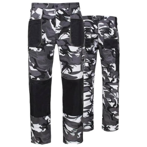 Spodnie PROTAC Camo wykonane z tkaniny w składzie poliester 65% i bawełna 35% o gramaturze 260 g/m² 7 funkcjonalnych kieszeni w tym podwójne kieszenie przednie, kieszenie tylne kryte patką na rzep, kieszeń typu bojówka z taśmą do zawieszenia narzędzi typu młotek itp. Wzmocnienia z materiału zabezpieczającego przed przetarciem na kieszeniach i kolanach z możliwością zastosowania wkładek nakolannikowych. Dodatkowa regulacja obwodu pasa. Rygle wzmacniające i potrójne szwy zwiększające wytrzymałość. Rozmiary od 48-60.