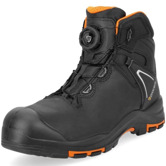 Trzewiki bezpieczne CENTAUR BLACK SPIN S3L SR HRO w innowacyjnej wersji z systemem sznurowania SPINPRO za pomocą linek stalowych oraz kółka mechanicznego. Obuwie z kompozytowym podnoskiem ochronnym odpornym na uderzenia z energią 200 J i zgniecenia 15kN oraz kevlarową wkładką antyprzebiciową chroniącą stopę przed przekłuciem o sile 1100N. Cholewka obuwia wykonana jest z wysokiej klasy naturalnej, licowej skóry bydlęcej typu "CRAZY HORSE" o grubości min. 2,2 mm. Podeszwa antypoślizgowa, antyelektrostatyczna, olejoodporna, wykonana z poliuretanu PU i gumy. Odporność spodów na kontakt z gorącym podłożem HRO na temperatury do 300'C. Klasa odporności na poślizg SR. Absorpcja energii w części piętowej.Komfortowa, anatomiczna wkładka z pianki poliuretanowej typu Hi-Poly. Wyściółka z oddychającego materiału 3D Sandwich. Wysoki miechowy język z materiału OXFORD. Elementy odblaskowe zwiększające bezpieczeństwo. Nadlany gumowy nosek chroni przed uszkodzeniami mechanicznymi. Komfortowa wkładka typu Hi-Poly. Kategoria S3L SR HRO. EN ISO 20345:2022. Dostępne w rozmiarach: 39 - 47. Pakowanie: 1/10 karton.