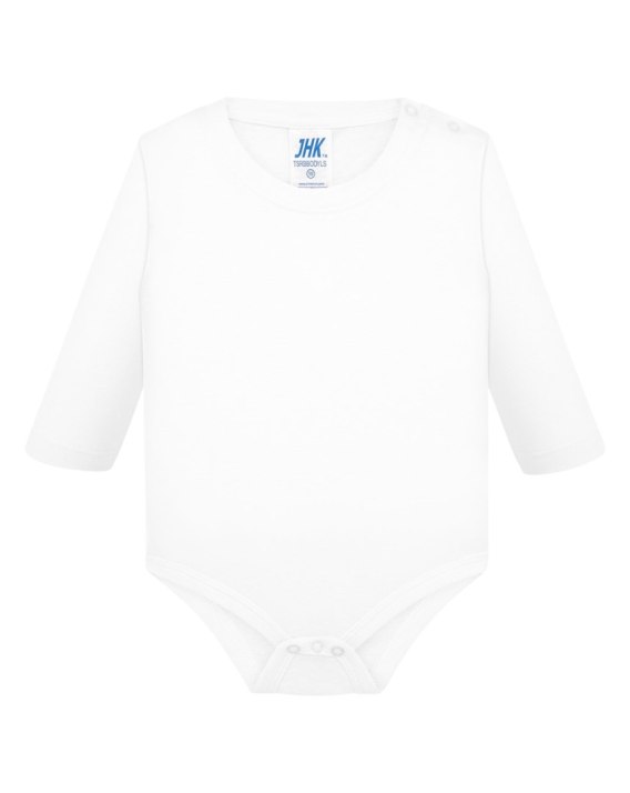 Body dziecięce z długim rękawem. Wykończenie pod szyją - lycrą. Zapinane na ramieniu i w kroku. Ściągacz 1x1. 100% bawełna.