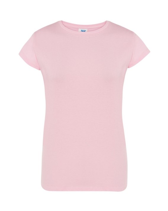 T-shirt damski z krótkim rękawem. Krój dopasowany do sylwetki. Ściągacz przy szyi. Szwy boczne. Podwójne szwy na ramionach i spodzie koszulki.  Łatwo usuwalna metka. 100 % bawełna.