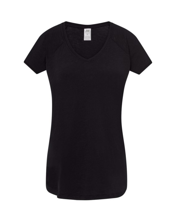 Damski Tshirt z rękawkami typu reglan. Single jersey, rękawki zawinięte. Modny niski ściągacz typu V-Neck. 100% bawełna.