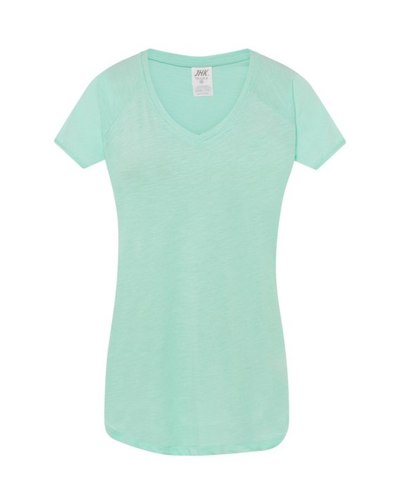 Damski Tshirt z rękawkami typu reglan. Single jersey, rękawki zawinięte. Modny niski ściągacz typu V-Neck. 100% bawełna.