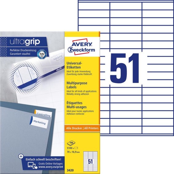 Trwałe Etykiety AVERY ZWECKFORM uniwersalne A4, 100 ark./op., 70 x 16,9 mm, białe |