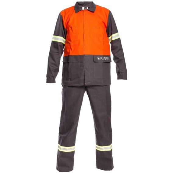 Ubranie ochronne Procera 5w1. Posiada właściwości trudnopalne, antyelektrostatyczne, chroniące przed termicznym działaniem łuku elektrycznego oraz chemikaliami, odpowiednie dla spawaczy. Zestaw składający się z bluzy i spodni lub opcjonalnie spodni ogrodniczek (na zamówienie), przeznaczony do ochrony użytkownika na stanowiskach, na których występuje zagrożenie zapaleniem w wyniku krótkotrwałego zetknięcia z płomieniem, oddziaływaniem ciepła konwekcyjnego, promieniowania cieplnego, rozpryskiem stopionego żelaza oraz do prac gdzie wymagane jest rozpraszanie ładunku elektrostatycznego oraz występuje zagrożenie kontaktu z chemikaliami. Bluza zapinana, kryta plisą, dwie kieszenie wewnętrzne, dwie kieszenie dolne kryte patką zapinaną na rzep. Aby zapewnić możliwie optymalną wentylację, bluza posiada otwory pod pachami i na plecach. Spodnie do pasa zapinane na guzik, dwie kieszenie boczne, kieszeń miarowa na prawej nogawce, rozporek zapinany na guziki, pas z tyłu z gumą do regulacji obwodu. - Skład materiału: 80% bawełna, 19% poliester , 1% antyelektrostatyczna nić węglowa - Gramatura: 300g/m2 - Kurczliwość: 2-3% - Kolor: szaro-pomarańczowy - Przeszycia: trudnopalne nici Tkanina wysoce wytrzymała na rozdzieranie, rozrywanie i tarcie oraz o wysokim komforcie użytkowania. Odzież spełnia wymagania norm: EN ISO 13688:2013, EN 1149-5:2008, EN ISO 11612:2015, EN ISO 11611:2015, EN 13034:2005 A1:2009, IEC 61482-2:2009 i posiada certyfikat oceny typu WE wydany przez Instytut Włókiennictwa w Łodzi. (nr jednostki notyfikowanej 1435) Wyprodukowano w Polsce. Dostępne rozmiary : 48-62.